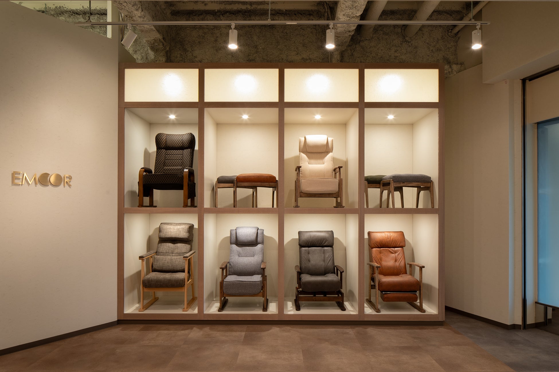 エムールでは従来、比較的座り時間が長い高齢者向けの椅子として開発を進めてきました。一方で、身体に合った高座椅子体験ができる「エムール体験ショールーム」に来場される年代層は年々若年化しています。来場の声を分析すると、家族で共用するソファから、個々の身体に合わせた椅子への置き換えを希望する来場者が増えていることがわかりました。