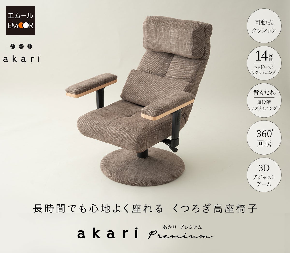 「身体に合った寝る・座る」を提案する健康家具ブランドEMOORを運営する株式会社エムール(東京都立川市:代表取締役 高橋 幸司、以下エムール)は、2024年12月6日より、理想的な背もたれと座り心地を追求した高座椅子『akari-あかり-プレミアム』の販売を開始しました。