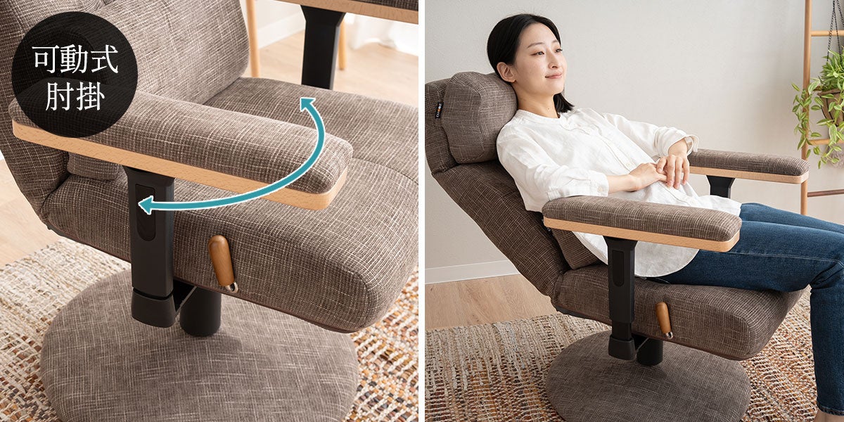 肘掛けは可動式。上下・左右に細かく調節が可能。体格や利用シーンに合わせて理想的なリラックス姿勢を実現します。