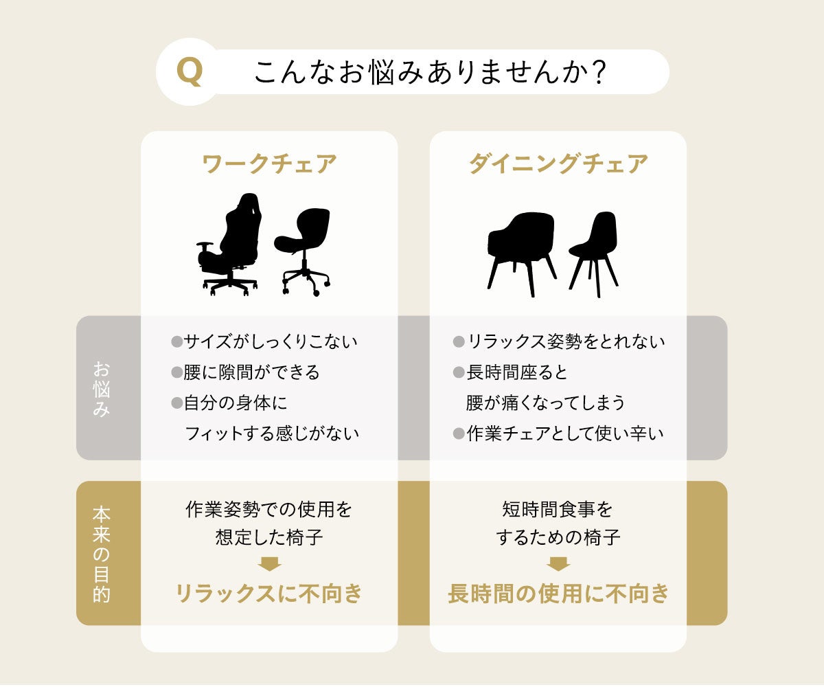 身体と椅子が合っていないと、長時間座っていられないだけでなく、腰やお尻、肩や首など様々な部位に痛みや違和感が生まれます。