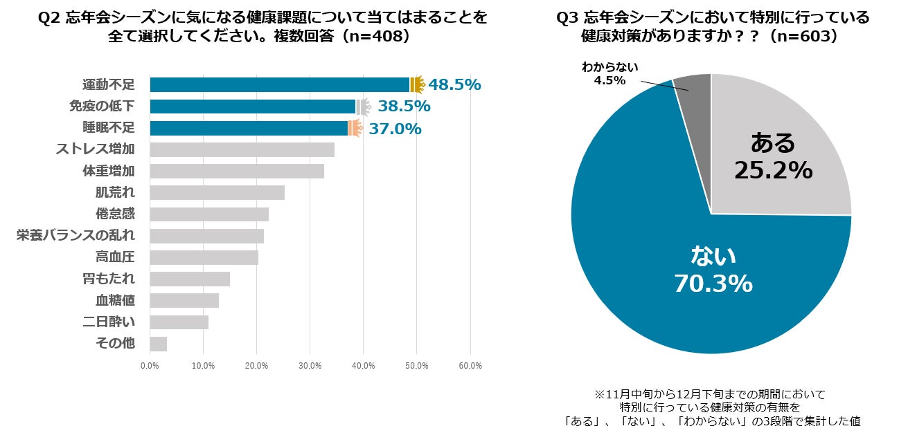 忘年会シーズンに気になる健康課題として最も多かったのは「運動不足」で48.5%。次いで「免疫の低下」の38.5%、「睡眠不足」37.0%と続きます。一方で、意識的に対策を実施している人は25.2%にとどまり、課題を認識しながらも70.3%の方は具体的なアクションに至っていない現状が浮き彫りとなりました。