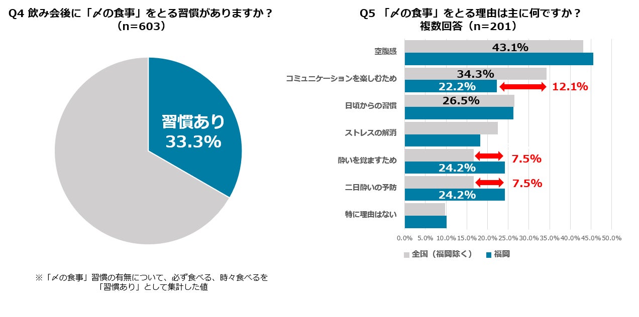 飲み会後の「〆の食事」習慣がある人は33.3%という結果になりました。その理由については、全国では、「空腹感」が43.1%でトップ。次いで、「コミュニケーションを楽しむため」34.3%、「日頃からの習慣」26.5%という結果になりました。一方、福岡に絞って深堀すると、全国比で「酔いを覚ますため」、「二日酔いの予防」の割合が高く、反対に「コミュニケーションを楽しむため」が低くなる傾向がみられました。このことから、福岡では〆の食事は空腹を満たすための習慣であることはもちろん、飲んだ後の”体調管理の手段”としても捉える傾向もあるのではと推察されます。