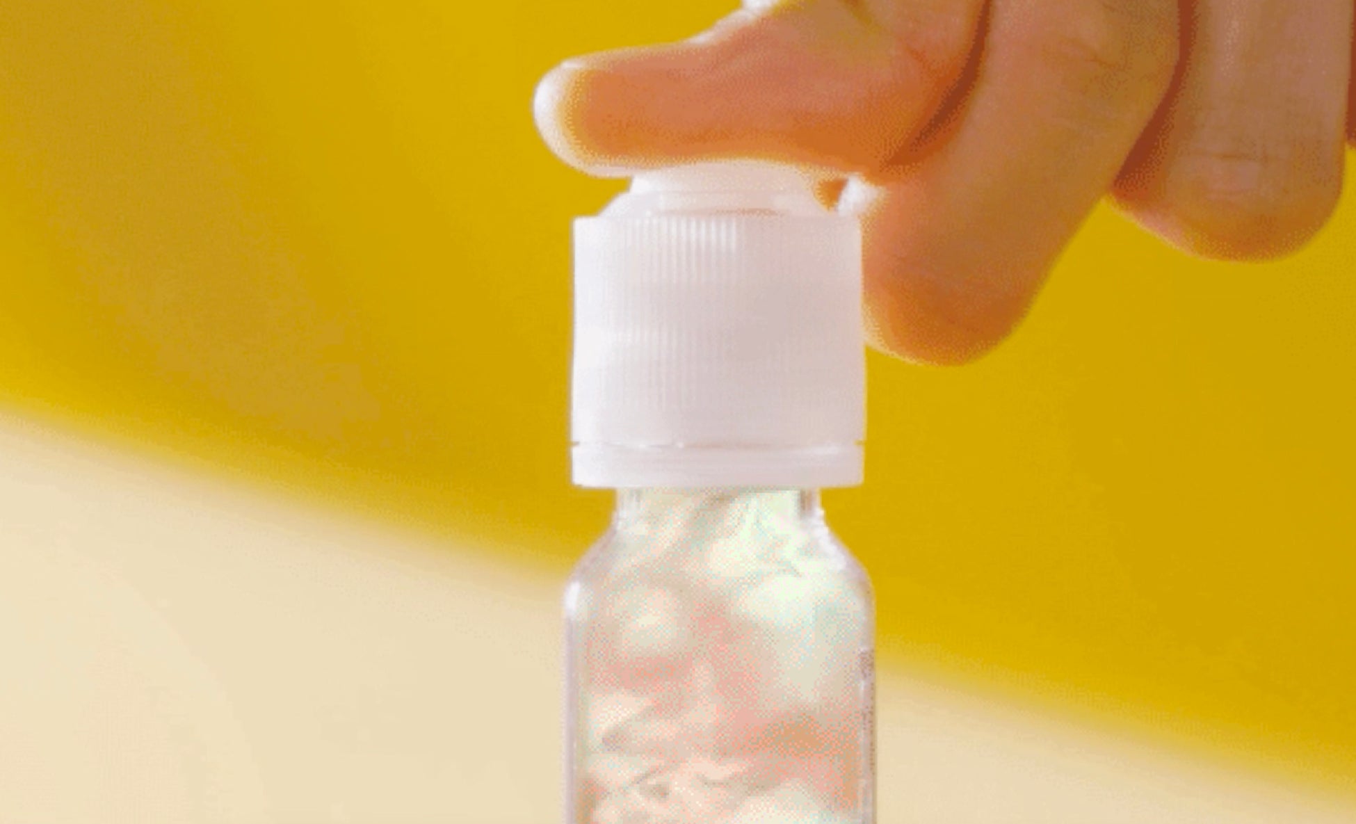 蓋の突起部分をトンと押し、キャップからビタミンパウダーを落とします。