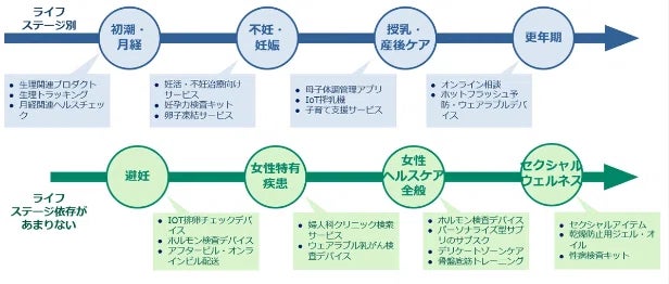 フェムテックのテーマは、月経、妊娠、不妊治療、育児、更年期障害、婦人科疾患、セクシャルウェルネスなどライフステージに応じた幅広い領域を対象としています。具体的には下記の例が挙げられますが、女性ヘルスケアの課題はこれに限りません。