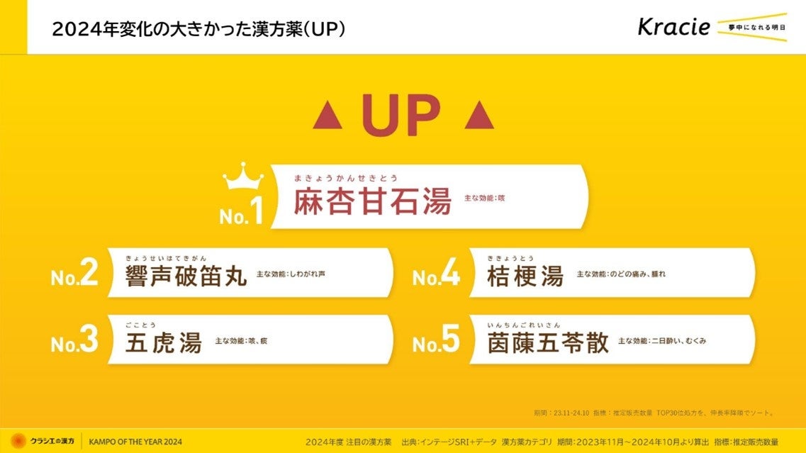 一般用漢方薬市場において、2023年11月~2024年10月の期間で最も伸長率が高かった漢方処方は、痰が切れづらい激しいせきに対応する『麻杏甘石湯(まきょうかんせきとう)』という結果になりました。2位にはのど関連の処方である『響声破笛丸(きょうせいはてきがん)』3位・4位には『五虎湯(ごことう)』『桔梗湯(ききょうとう)』が入り、上位は全て“咳・のど”に関連する処方がランクインしています。