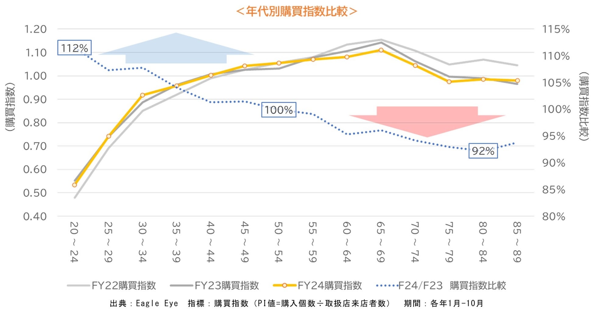 購買指数は50歳前後を分かれ目に若年層では上昇、高齢者層では低下傾向に