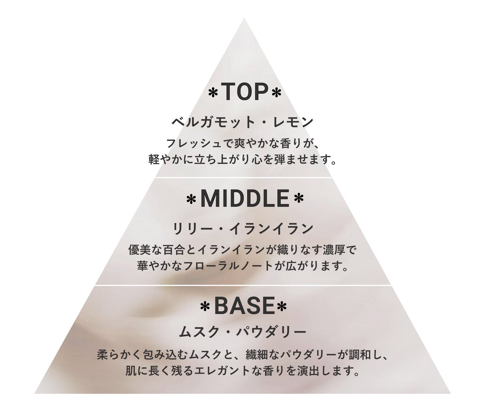 柔らかく包み込むムスクと、繊細なパウダリーが調和し、