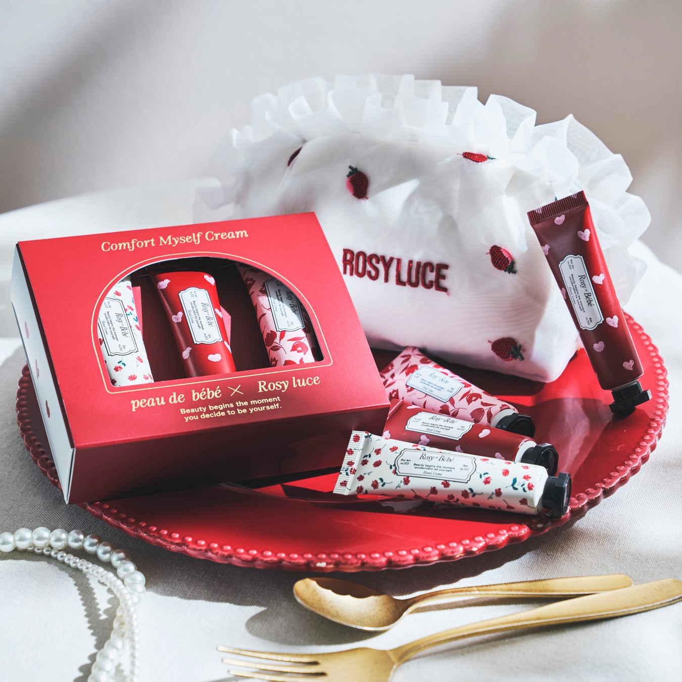 Rosy luceオリジナルのハート柄ギフトBOX &ハンドクリームといちごの刺繍が施された
