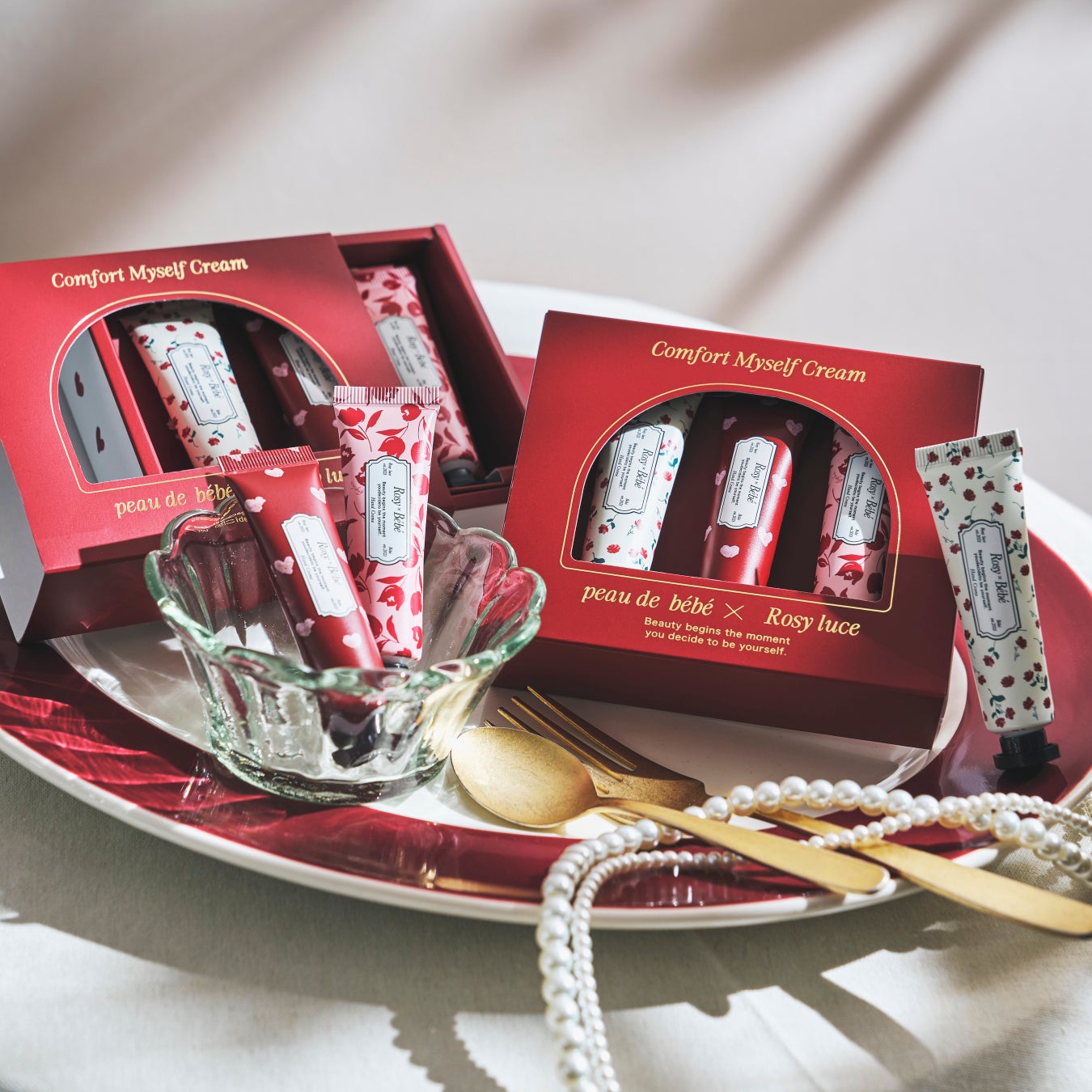 板野友美がディレクションを務めるライフスタイルブランド「Rosy luce」とコスメブランド「peau de bébé」それぞれのブランドの特徴を融合した、初のコラボレーションで送るアイテムは特別なハンドクリームセット【Comfort Myself Cream】。