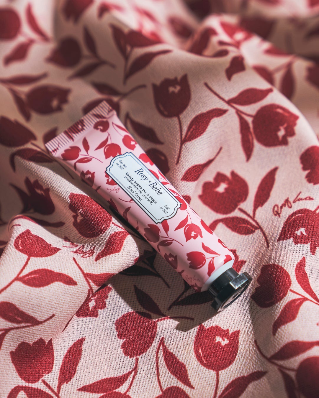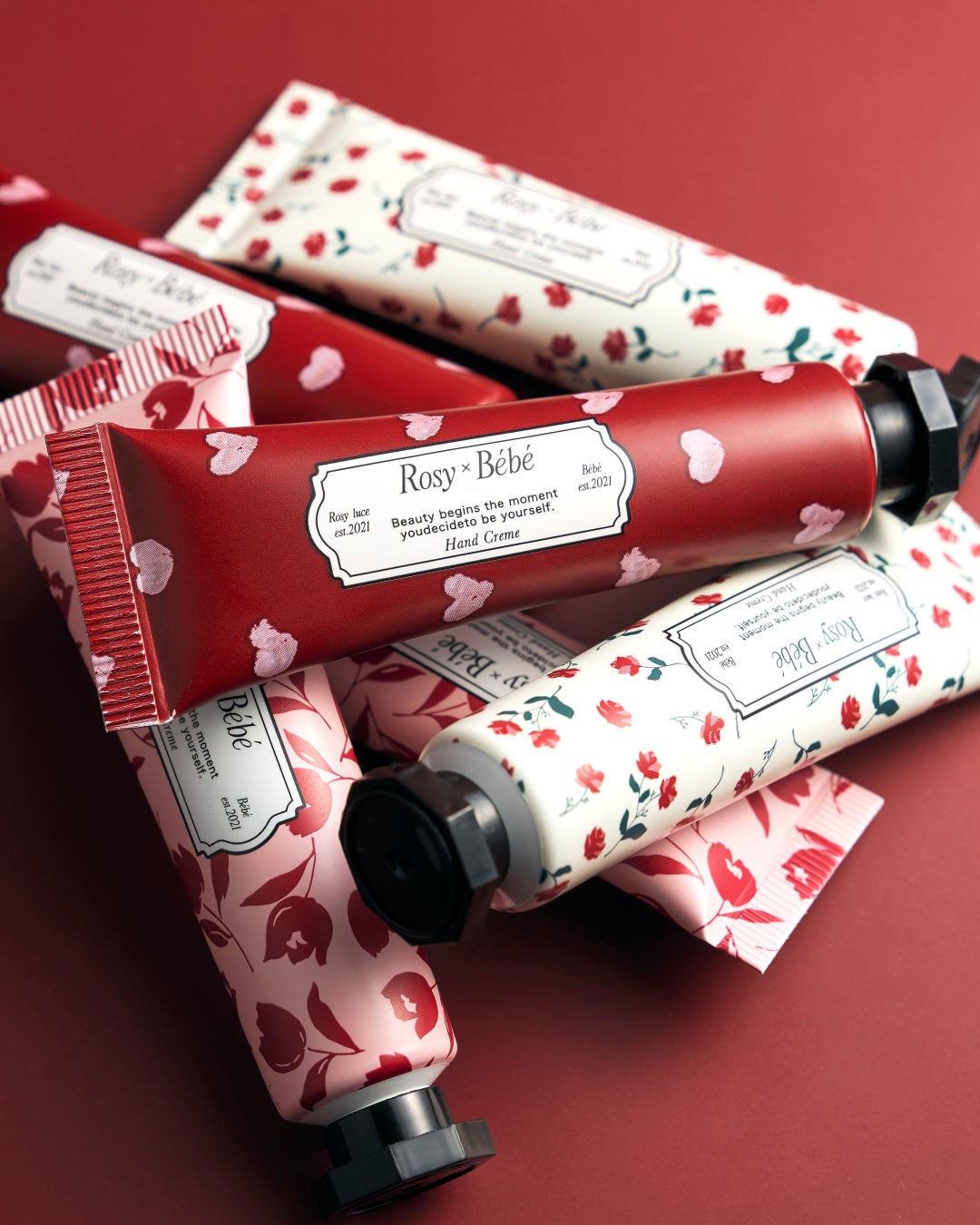 Rosy luceのシグネチャーな花柄、ハート柄をあしらった3種類のチューブパッケージ。