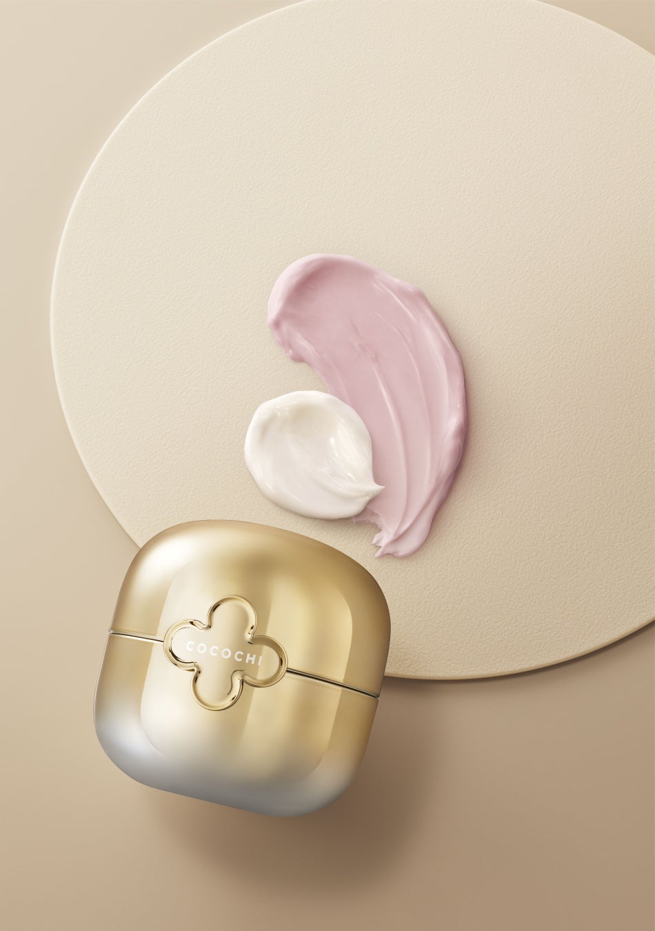 「COCOCHI AG グローイング エッセンス クリーム マスク」 は、2ステップのスペシャルケアで、透明感*²あふれるハリツヤ肌に導く、洗い流すタイプのクリームマスクです。白色の「エッセンスクリーム」と、ピンク色の「エッセンスマスク」を重ね、15分後に洗い流し、いつものお手入れをすることで肌の透明感*²を高め、ハリツヤのある肌へ導きます。 丁寧にクリームを塗布し、15分間のリラクゼーションを堪能することで、自分の肌と向き合い、自分をいつくしみ、理想の肌へと誘います。