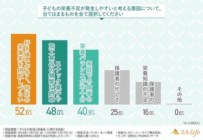 そこで、「子どもの栄養不足が発生しやすいと考える要因について、当てはまるものを全て選択してください」と質問したところ、『好き嫌いが多く、特定の栄養素を摂取しづらい(52.6%)』と回答した方が最も多く、次いで『スナック菓子や加工食品の頻繁な摂取(48.0%)』『家庭での食事の栄養バランスが不十分(40.9%)』となりました。