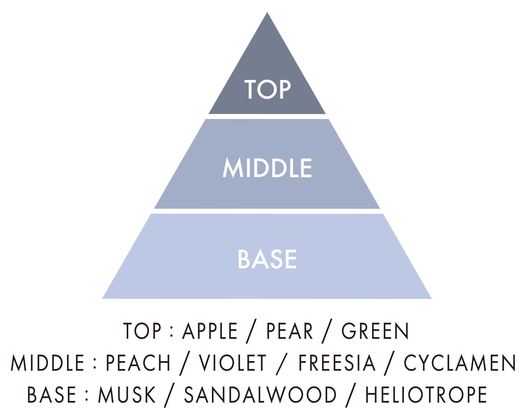 フルーティーノートから始まり、時間の経過とともにピーチの瑞々しい甘さ、そしてサボン系の爽やかさとホワイトフローラルのほのかな甘みが、落ち着きのある凛とした印象を与えます。