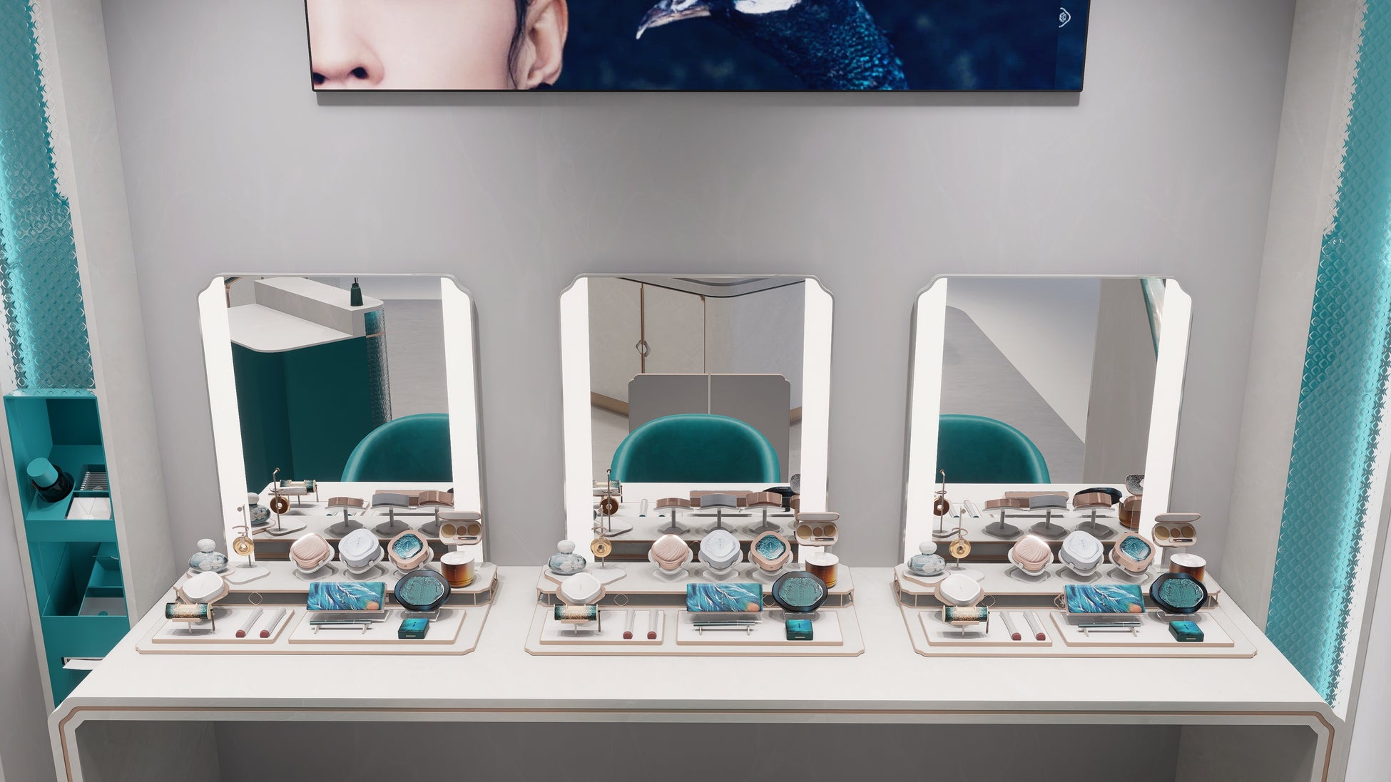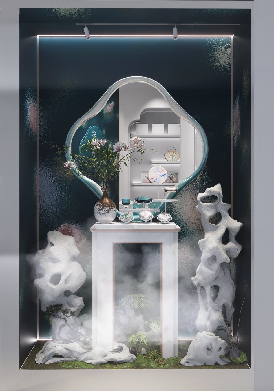 伝統的な中国庭園の美を、現代において再解釈し表現したものを店舗のいたるところに取り入れています。優美な曲線を描く鏡台は、中国の蘇州付近にある太湖周辺の丘陵から切り出される穴の多い複雑な形の奇石である「太湖⽯(たいこせき)」をイメージしています。また、ディスプレイ台は、中国古来、庭園の水辺で水の流れに合わせて詩歌を詠む歌遊びに由来し、湖と⼭々の美しい景⾊を再現した「曲⽔流觴台(きょくすいりゅうしょうだい)」をご用意。