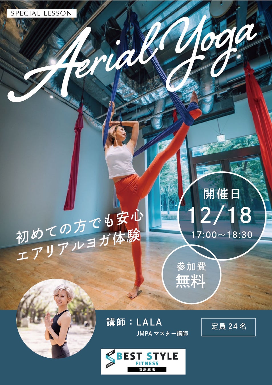 JMPAマスター講師でもあるLALAインストラクターがエアリアルヨガのイベントレッスンを開催します!初めての方でも安心のプログラム構成となっておりますので、経験者はもちろん、興味のある方はこの機会にぜひ!