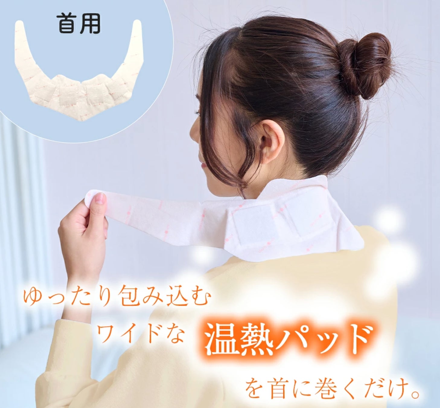 ワイドな温熱パッドが首全体を包み込み、デスクワークの疲れやこりを和らげます。約2時間持続するため、仕事中や家事の際も快適にご使用いただけます。