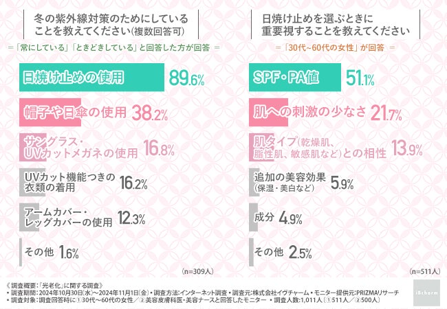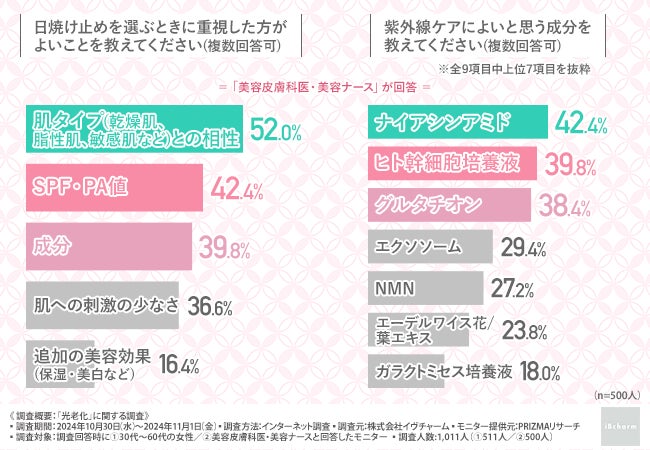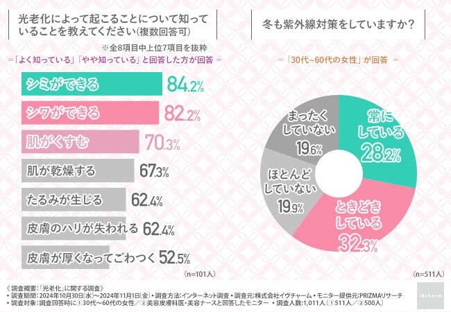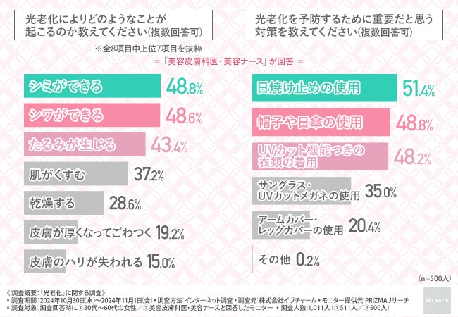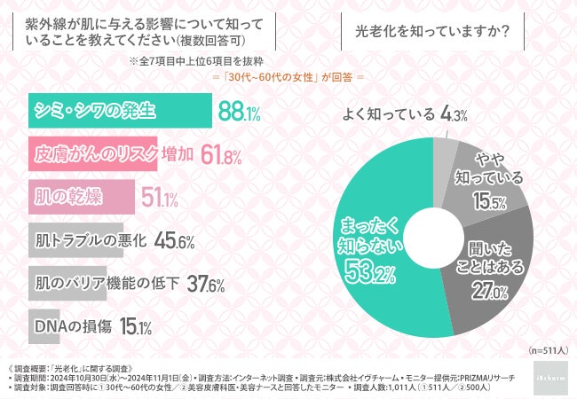 そこで今回、株式会社イヴチャームhttps://ibcharm.co.jp/)は、①30代~60代の女性:511名/②美容皮膚科医・美容ナース:500名を対象に、「光老化」に関する調査を行いました。