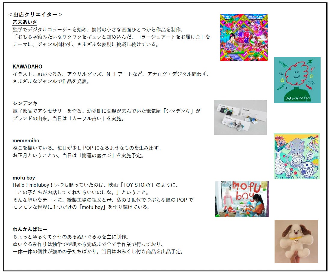新年の運試し!今年の干支(ヘビ)をモチーフとした個性的なおみくじなど、ゲーム感覚で楽しむことができる斬新なおみくじゲームセンターを展開。複数のクリエイターが頭を捻って創ったPOPな運試しコンテンツをはじめ、似顔絵や占いなど、ここでしか体験できない独特なお正月を楽しめるほか、グッズやアクセサリーなどお土産アイテムも販売します。また、新年の思い出を残せる特設フォトブースも設置します。