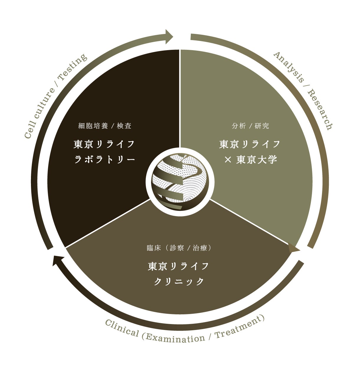 東京リライフグループは、抗加齢・ヘルスケア領域において、世界トップレベルの研究機関と連携。アカデミアの最先端研究・技術を臨床現場へいち早く実装させることを可能とした、“世界最高”を目指す、三位一体の再生医療グループです。
