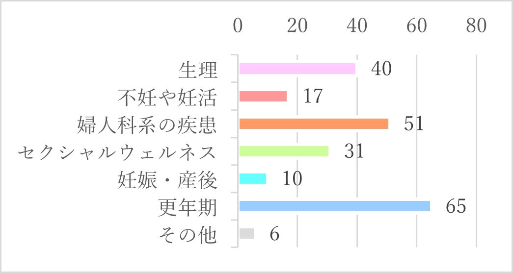 また、参加してみたい内容では「フェムケアヨガ・サプリメント体験(54人)」、「膣ケア講座(48人)」、「実際に手に触れるフェムケアグッズ紹介(39人)」の順で、日常的・中長期的に発生する健康課題に高い関心を寄せていることがわかります。
