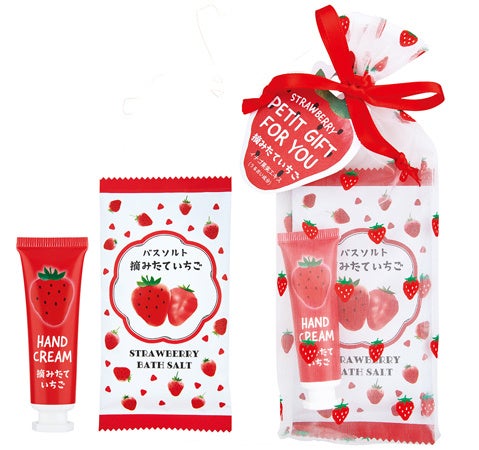 いちご柄のオーガンジーバッグに、ジューシーないちごの香りを楽しむバスソルトと手肌をしっとりうるおすミニハンドクリームが入ったセット。お配りギフトにもおすすめです。