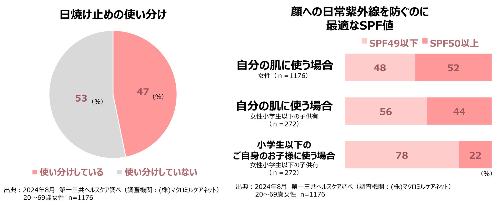 当社の調査によると、20~69歳の女性の約半数が、使用シーンや使用部位、天候や季節によって日焼け止めを使い分けていることがわかりました【図1】。また、自身の肌に使う場合に比べて子どもに使用する場合では、高いSPFの日焼け止めの使用を控える傾向が見られます【図2】。