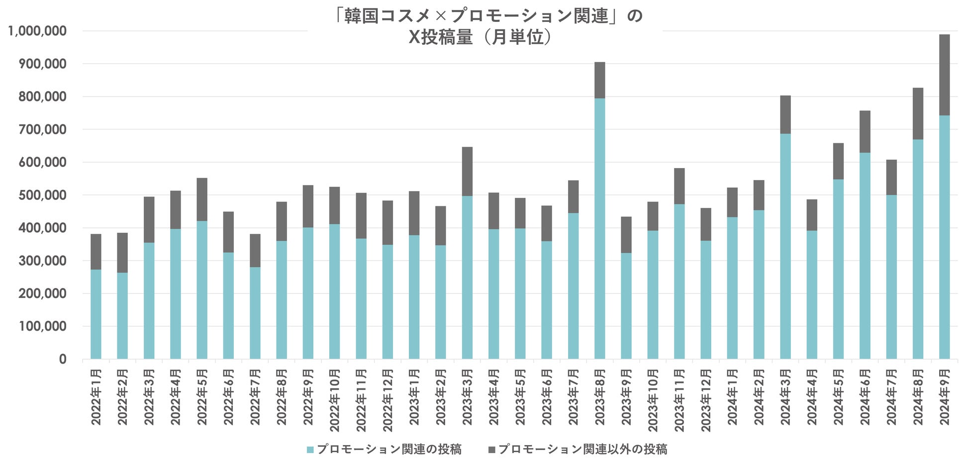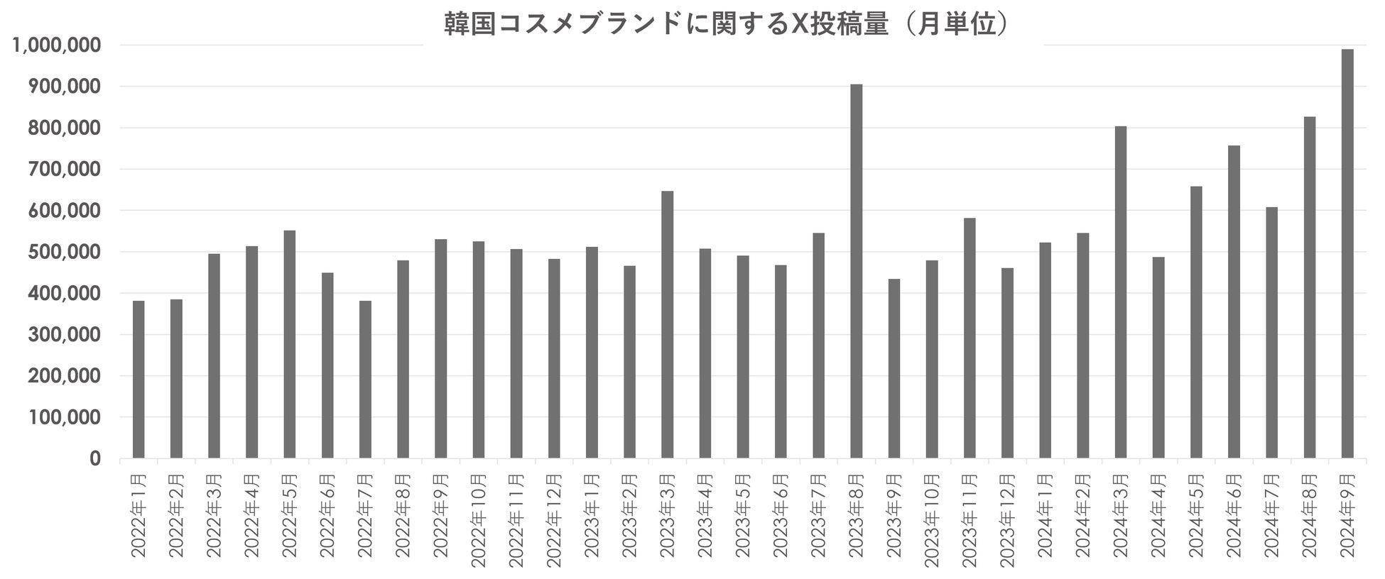 韓国コスメに関する投稿量は2024年9月には月間100万件近くに