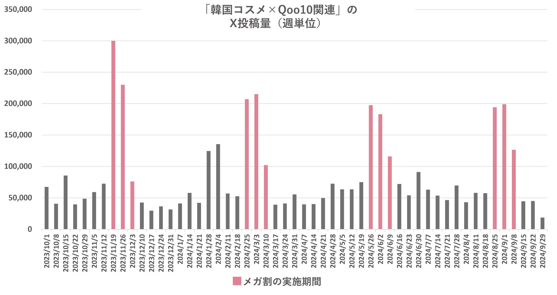 韓国コスメが手軽に購入できる場所として人気が高まっている「Qoo10」ですが、X内における韓国コスメの共起語としては、2023年10月~2024年9月の1年間で「amazon」の約20倍、「楽天」の約37倍と圧倒的に多いことが分かりました。Qoo10関連の投稿量を週次で見てみると、定期的に開催される大型セール「メガ割」のタイミングで急増しており、「メガ割」の存在が韓国コスメに関するオーガニック投稿の投稿量増に寄与していることが分かります。