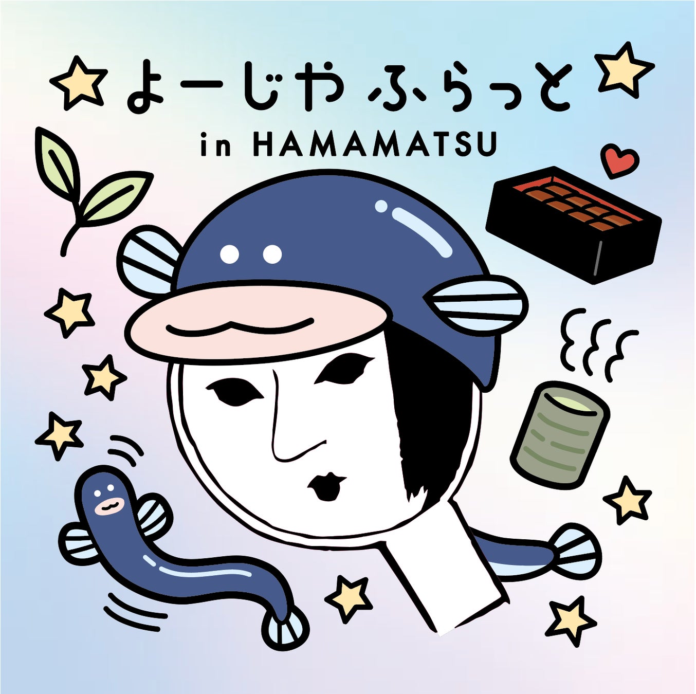 静岡県の名物を散りばめ、うなぎの帽子をかぶったクールな「よじこ」がデザインされたステッカーをぜひゲットしてください!