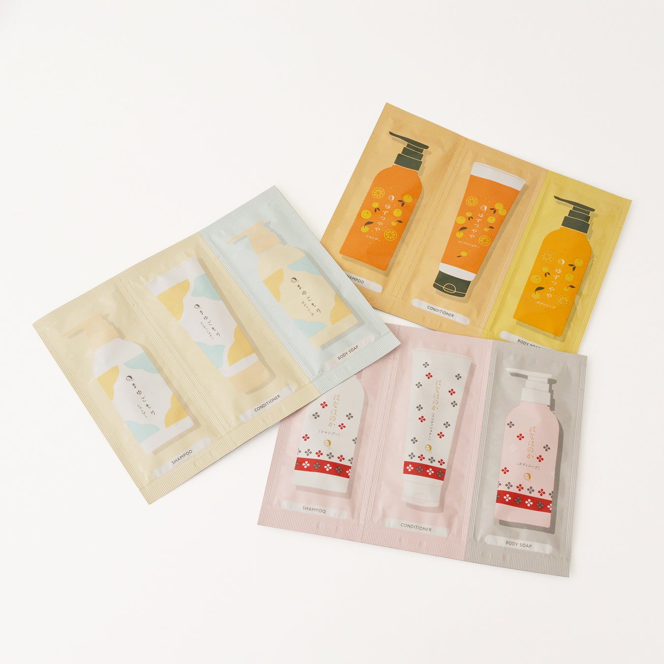・シャンプー/ヘアコンディショナー/ボディソープ 各1回分パウチサンプル (まゆごもり・はなほのか・ゆずつやや)