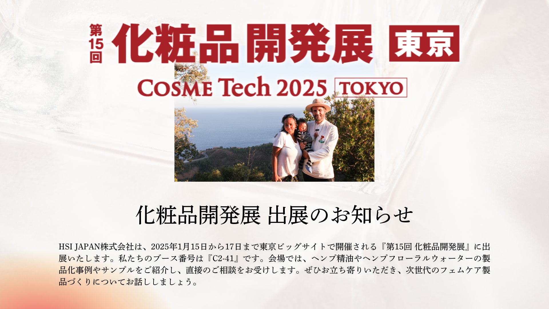 本提携を通じて、HSI JAPAN株式会社はヘンプ製品の市場拡大を図ると同時に、フェムテックをはじめとした新たな分野への展開も計画しています。さらに、2025年1月15日~17日に東京ビッグサイトで開催される『第15回 化粧品開発展』で、提携の成果として開発したサンプル製品を初披露する予定です。