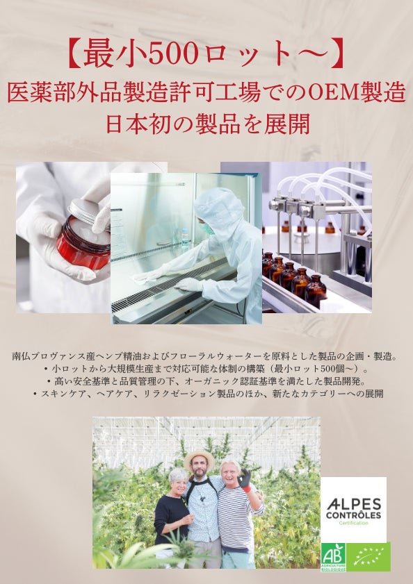 HSI JAPAN株式会社(本社:東京都港区、代表取締役:松本真依)は、化粧品および医薬部外品製造許可を持つ株式会社ジャイド(株式会社Rays企画、本社:群馬県伊勢崎市)との業務提携を発表しました。この提携により、南仏プロヴァンス産オーガニックヘンプ精油とオーガニックヘンプフローラルウォーターを活用した製品の開発・製造が、これまで以上に迅速かつ効率的に行える環境が整いました。