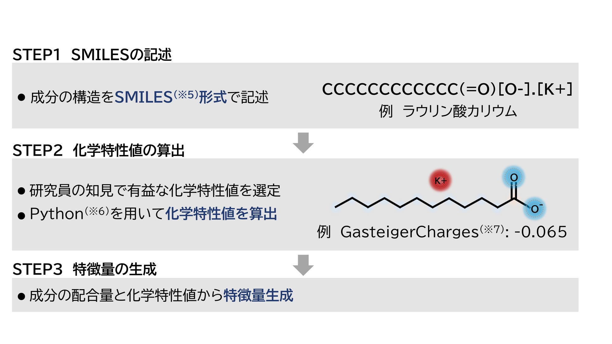 そこでこの度、ボディソープの新たな組成開発に向けて、機械学習の特徴量生成の手法を独自に確立することに取り組みました。