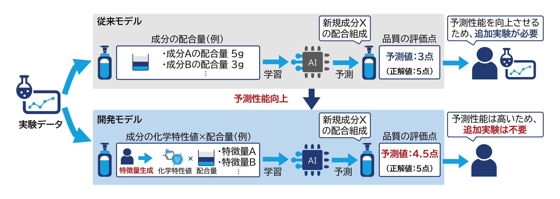 そこで本研究では、成分の化学特性に着目し、研究員の知見を効果的に組み込んだ特徴量を機械学習モデルに導入することで、新規成分を配合したボディソープの品質特徴とその影響要因を高精度で予測する手法を確立しました(図2)。