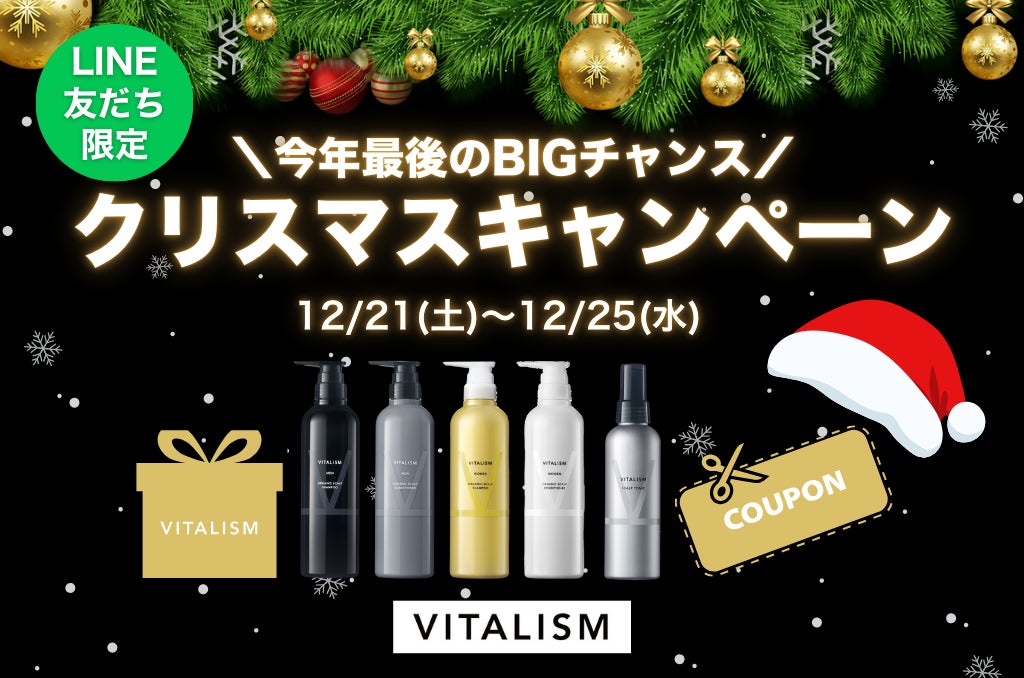 株式会社ヘアジニアス・ラボラトリーズ(本社:東京都渋谷区、代表取締役:津田知明)が展開するトータルケアブランド「VITALISM」はクリスマスを記念し、2024年12月21日(土)〜12月25日(水)まで公式LINE登録者様限定のキャンペーンを開催いたします。