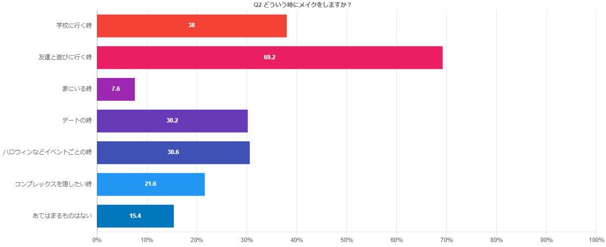一番多かったのが、友達と遊びに行く時、次いで学校に行く時、ハロウィンなどイベントごとの時などにメイクをすることが多く、「最近どんなリップを買った?」「どんなポーチを買った?」など友達とメイク情報をシェアするなど、メイクをコミュニケーションの1つとして使っていることも推測される結果となりました。