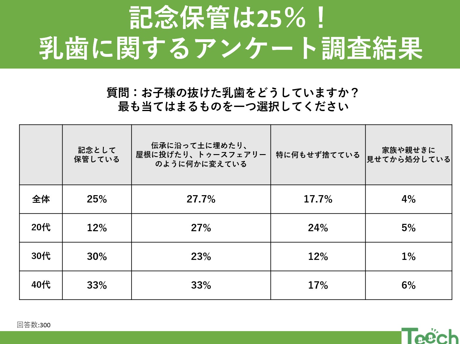 今回のアンケート調査は20代から40代の子を持つ男女に『お子様の抜けた乳歯をどうしていますか?』とお聞きし、以下のような結果が得られました。