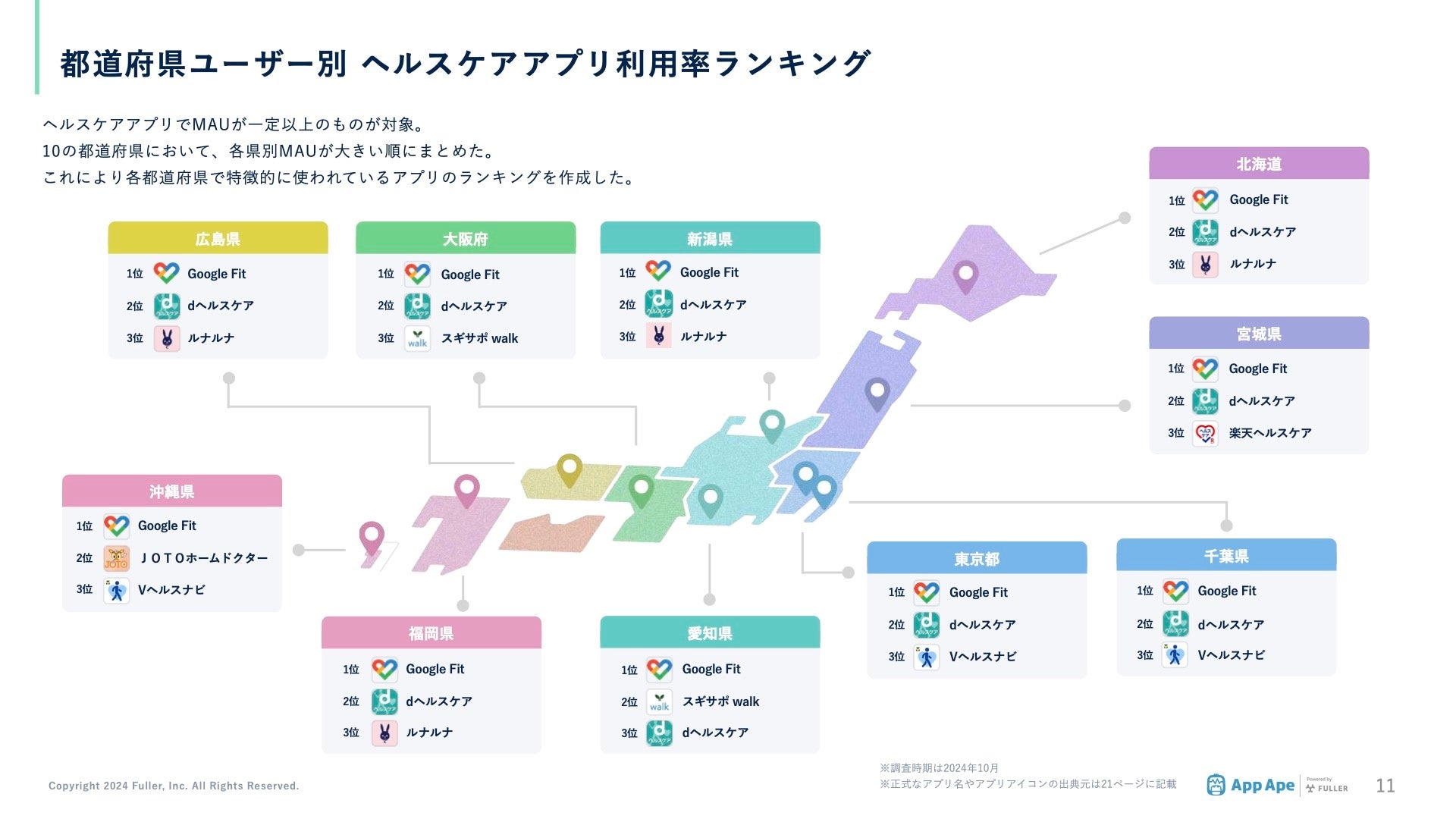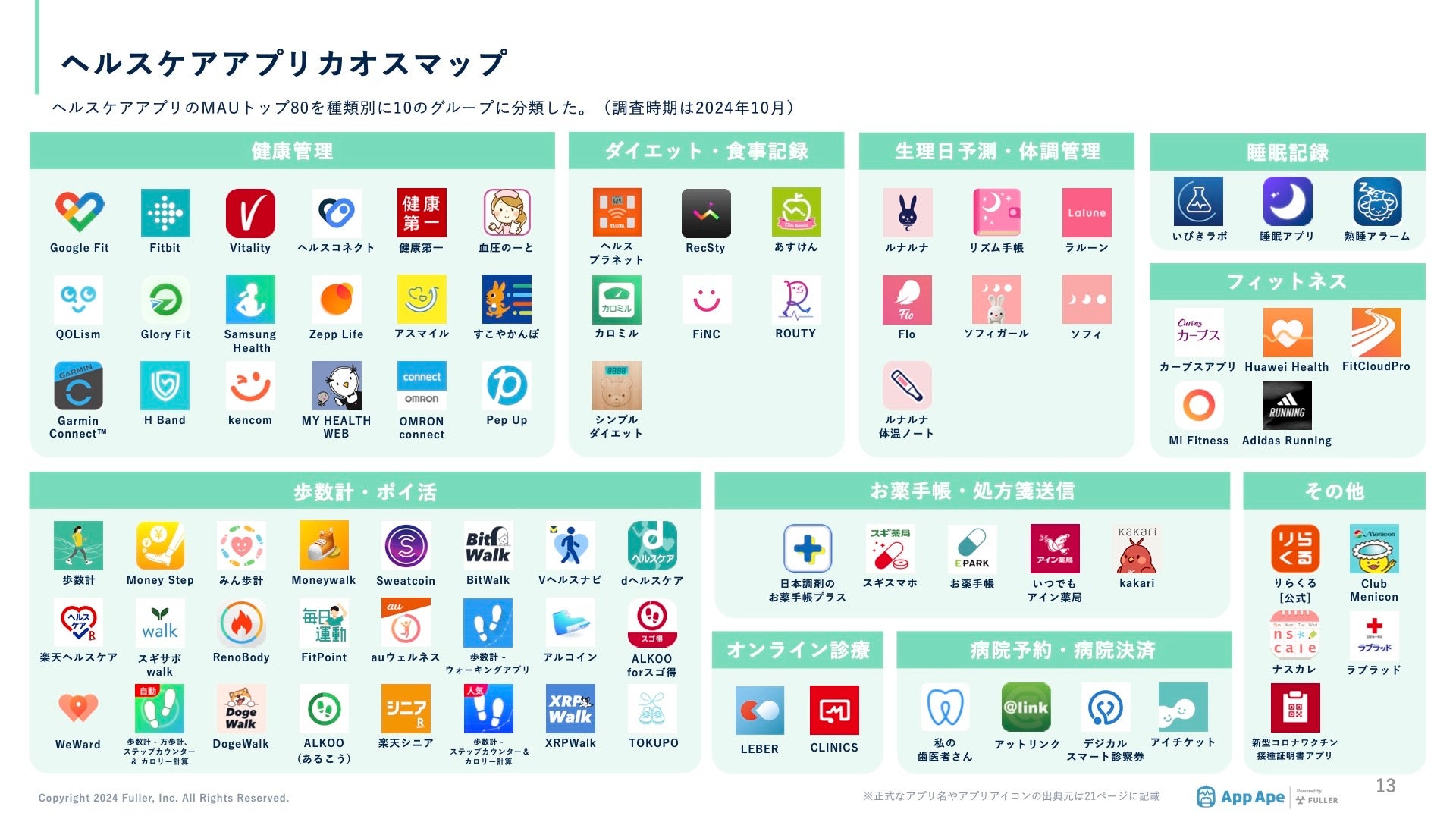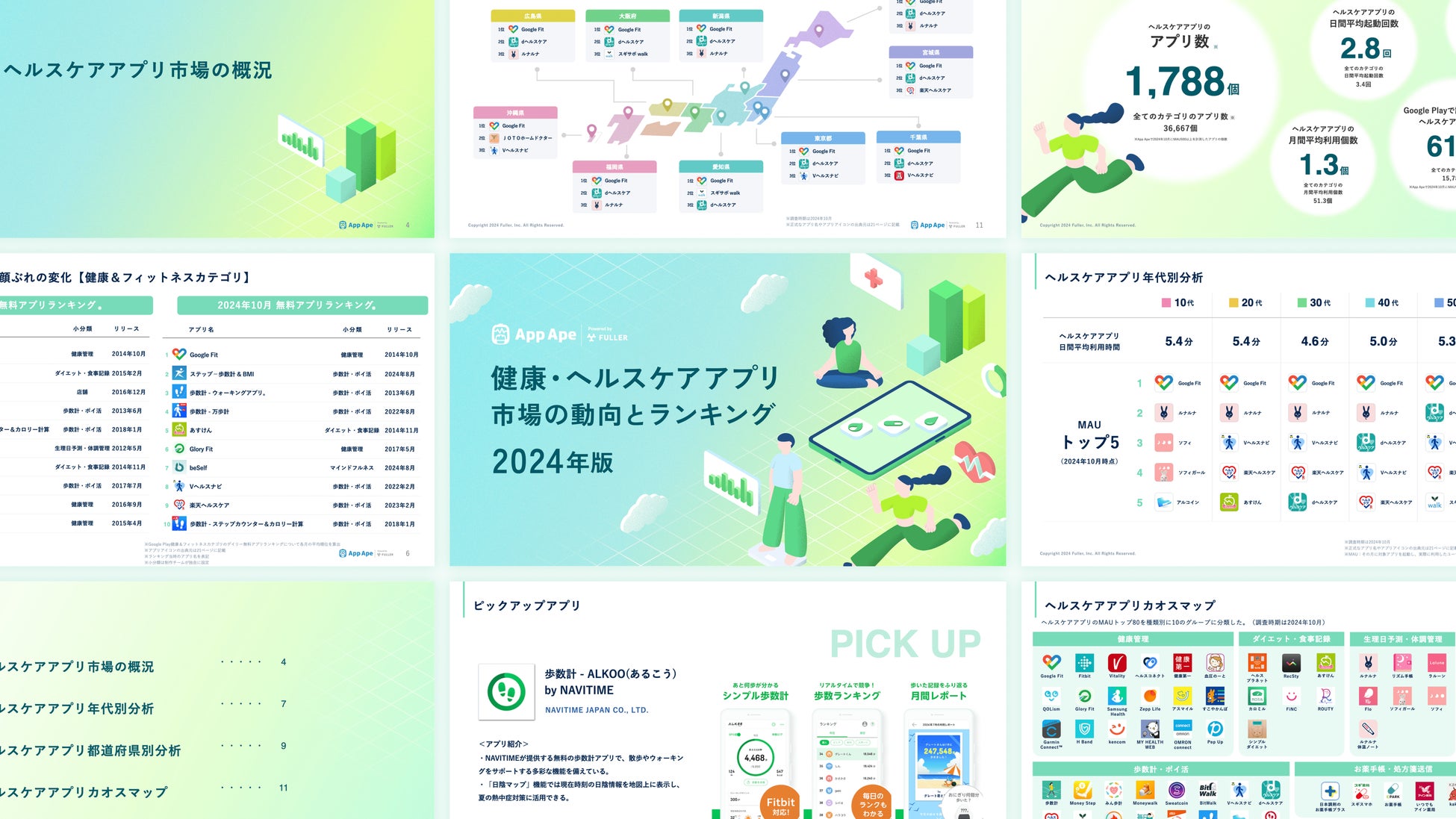 フラー株式会社(本社:新潟県新潟市、代表取締役社長:山﨑将司、以下「フラー」)は、アプリ市場分析サービス「App Ape(アップ・エイプ)」で蓄積するデータをもとに、ヘルスケアアプリの動向や特徴をまとめた「健康・ヘルスケアアプリ市場の動向とランキング2024年版」を公開しました。