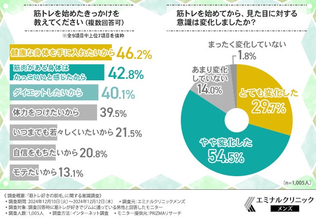 大多数のジムに通う男性がトレーニング中にムダ毛が気になった経験があり、筋トレを始めてから『見た目への意識が変化した』と回答した男性は約8割にのぼりました。ジムに通うことで自分の身体を意識したり、鏡で見る機会が増えることで、ムダ毛が気になる機会が増えるようです。