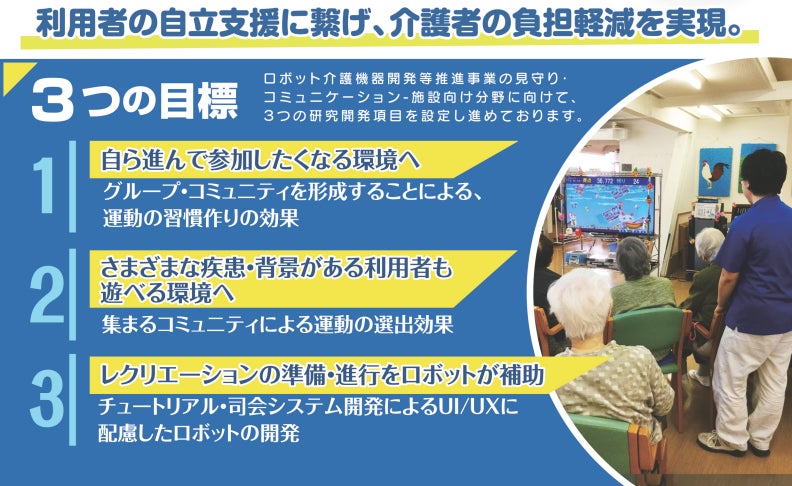 TANOは令和5年度にAMED(国立研究開発法人日本医療研究開発機構)の「ロボット介護機器開発等推進事業」に採択されており、さらなる機能強化と使いやすさの向上が図られています。これにより、利用者は楽しみながら利用でき、スタッフの負担も軽減されます。さらに、モーションセンサーによるデータ収集を通じて効率的なケアが可能となり、生産性向上にも貢献します。