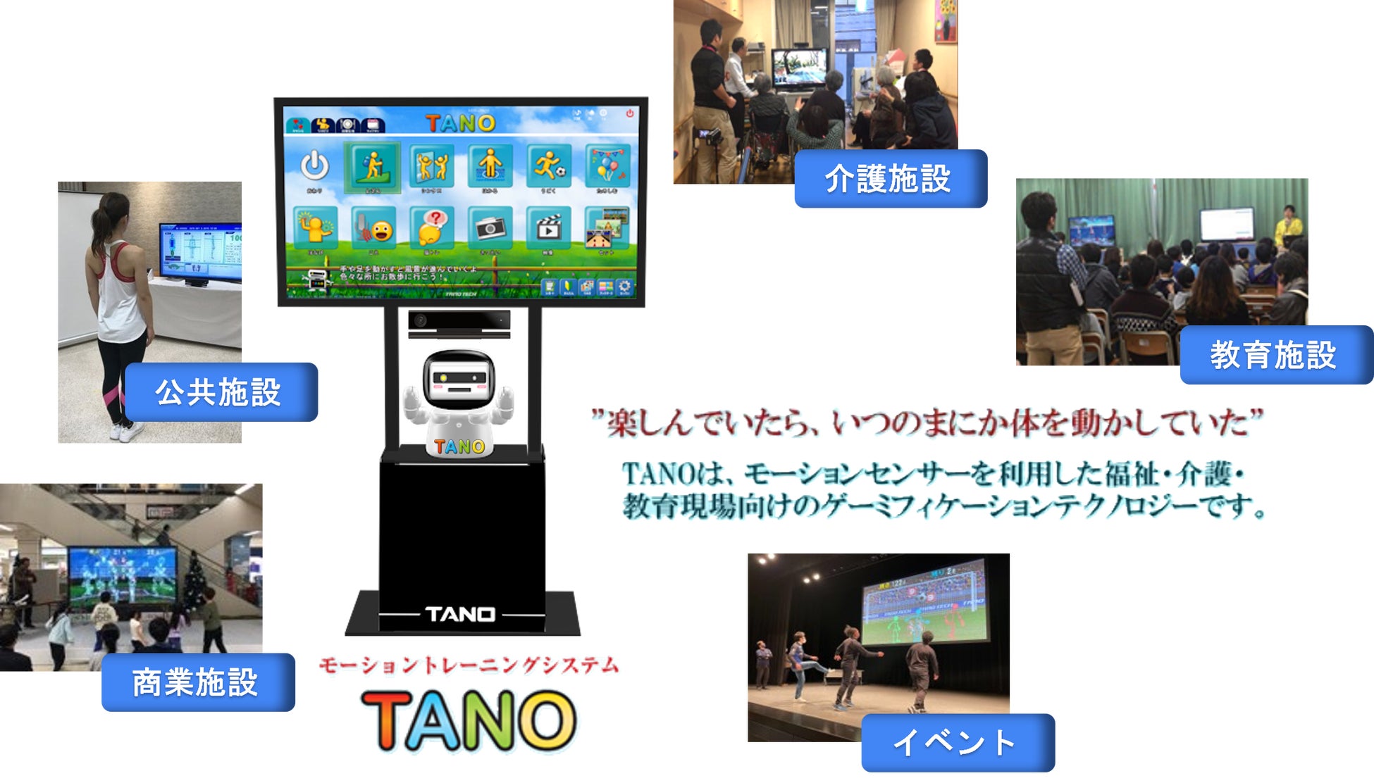 TANOはセンサーの前に立つだけで体がコントローラーとなり、300種類以上の運動・発声・脳活性化プログラムを非接触・非装着で楽しくトレーニングすることが可能です。