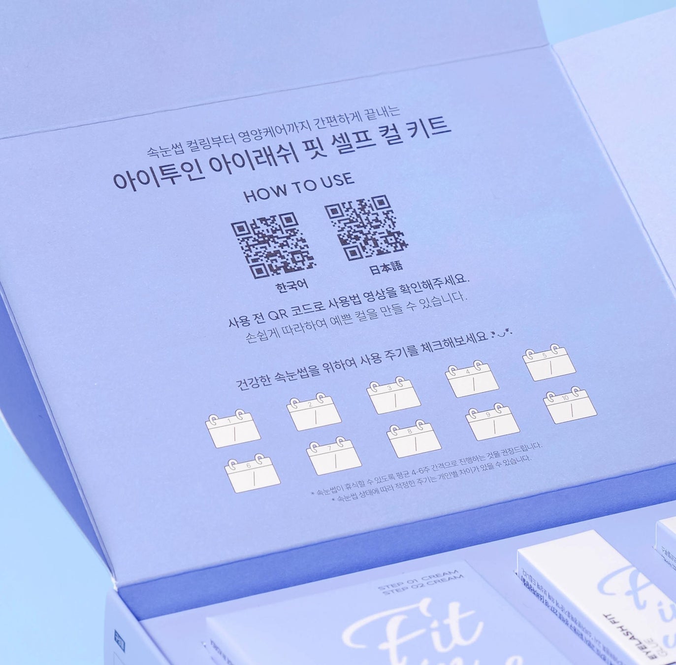 「セルフまつ毛カール&ケアオールインワンキット」は、「セルフまつ毛カールセット」に加え、まつ毛集中ケア用クリーム「ビオチン600ブースター」を含む構成です。特に、必須アイテムのカールグルーと、お客様の声で再登場したラッシュバームを選択可能な点が特徴です。また、セルフケアの周期をよりきめ細かくサポートするため、オールインワンキット専用パッケージにカレンダーを同梱し、QRコードで使用方法の動画を確認できるようにしました。