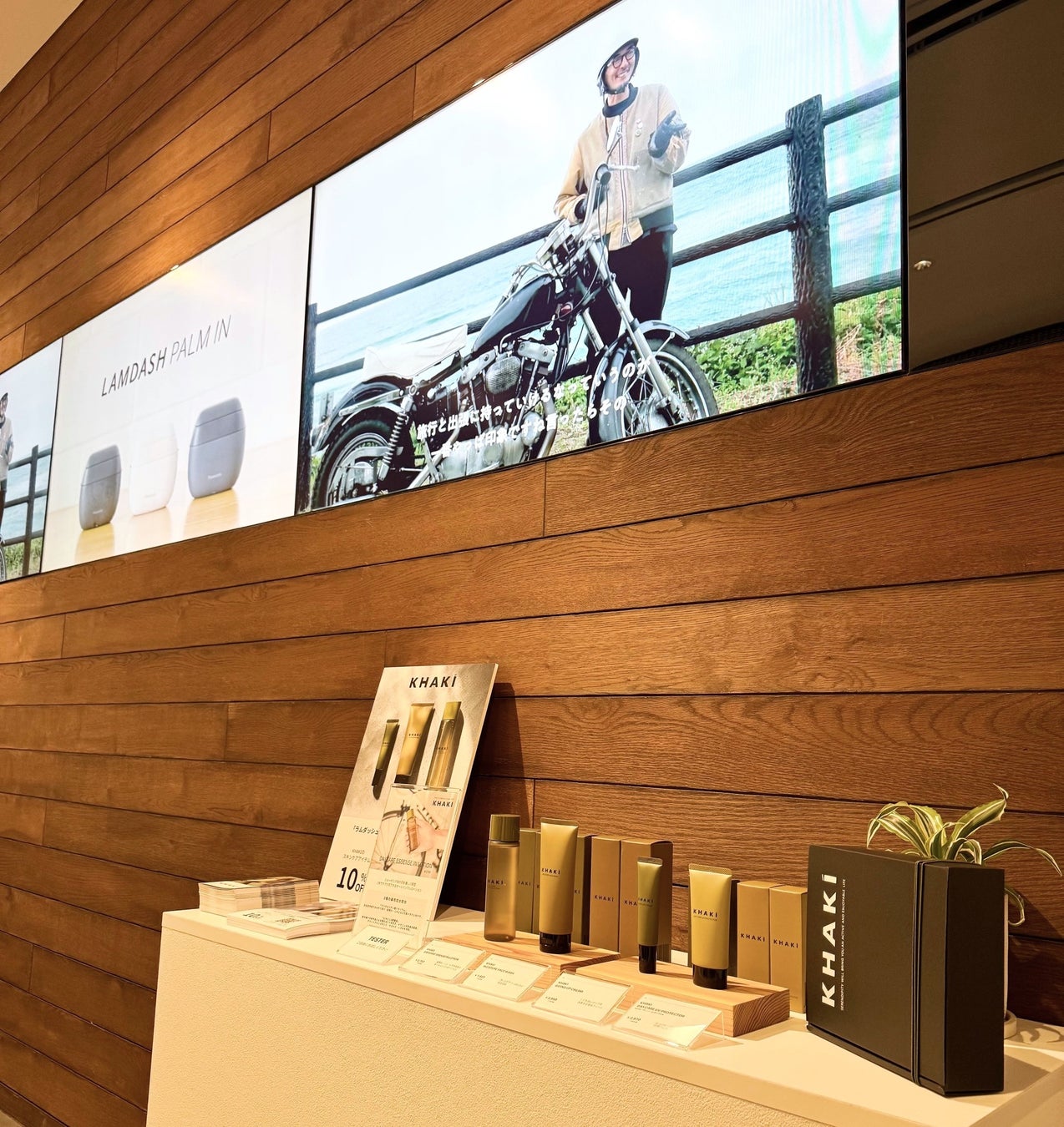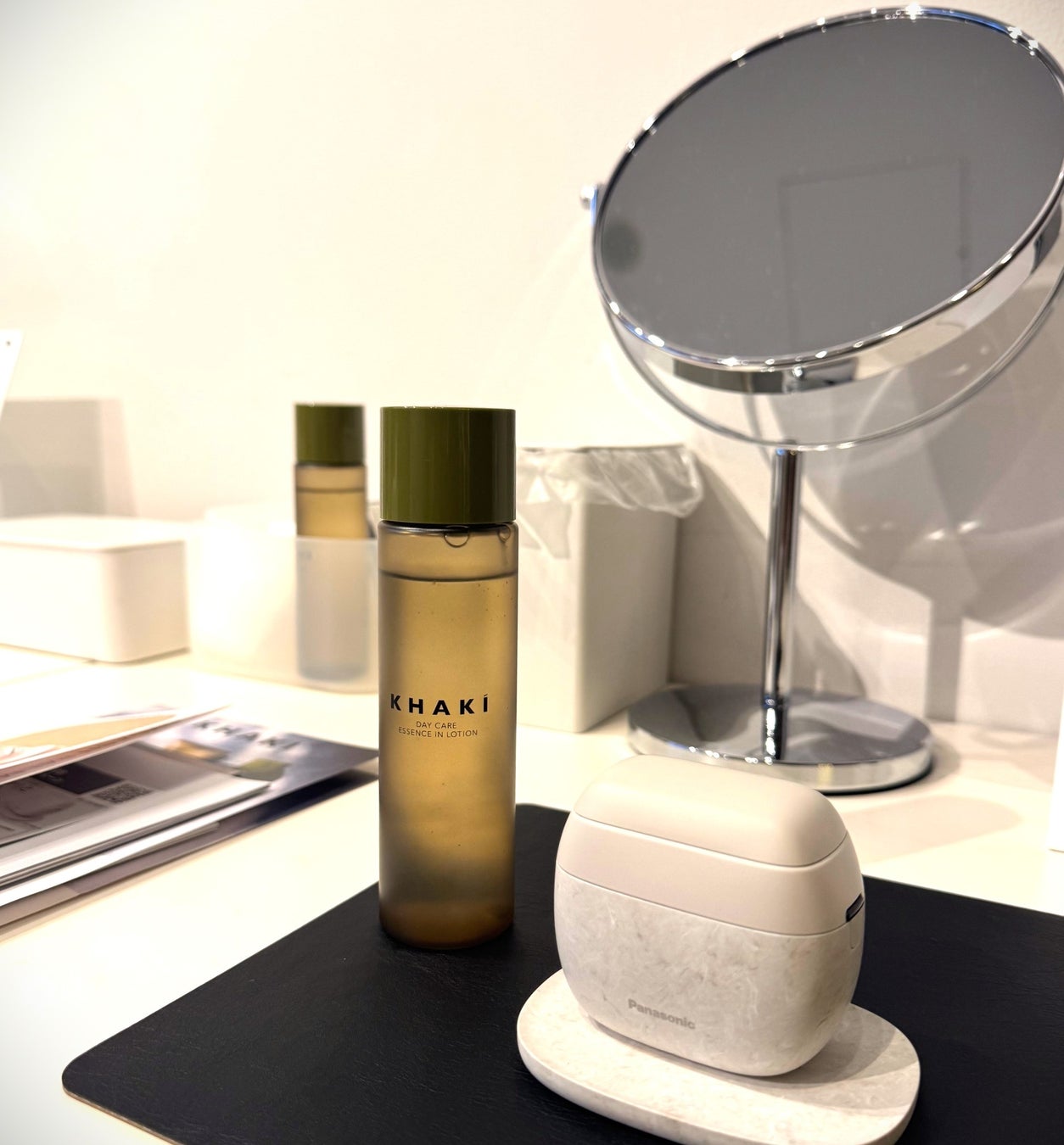 上質なライフスタイルや旅行をイメージしたポップアップ内の世界観の中で、「ラムダッシュ パームイン」のシェービングを体験いただいた後には、肌への保湿力が高くシェービングとも相性が良いオールインワン化粧水の「KAHAKI デイケアエッセンスローション」をお試しいただけます。