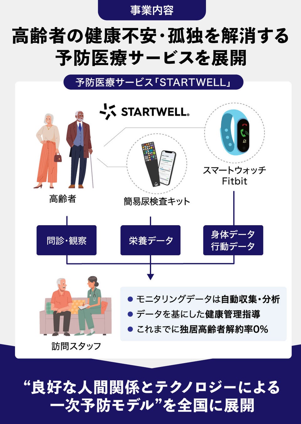 弊社は、大きな時代の変化である「長寿命化」「医療費・介護費の抑制」「地域福祉の崩壊」によって顕在化された顧客ニーズに応えるため、健康データのモニタリングと看護師の定期訪問サービスを組み合わせ、高齢者の健康維持と社会的孤立・孤独の解消を図る「STARTWELL」を開発しました。