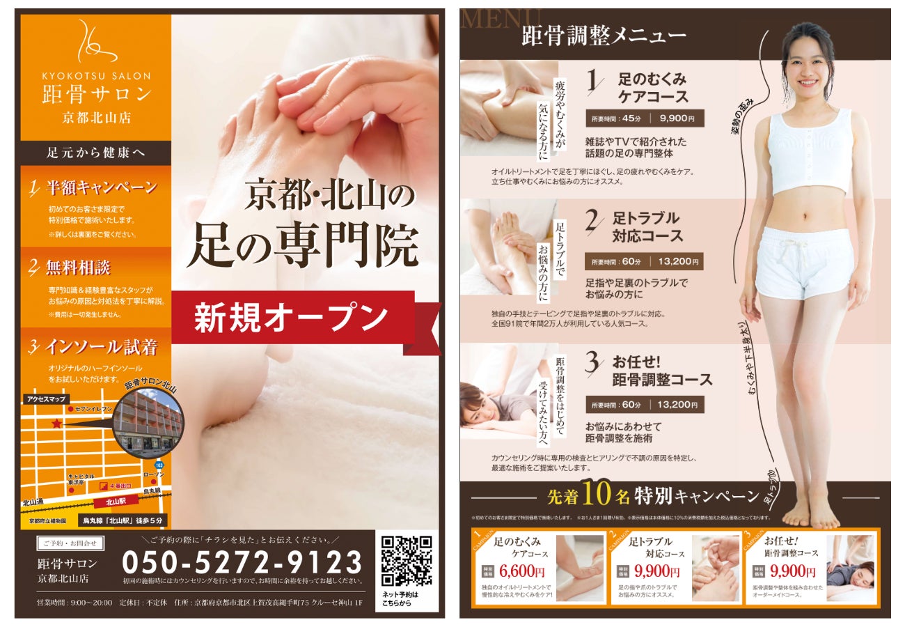 新規OPENを記念して全てのコースが初回限定の特別価格でのご提供となっております。ぜひこの機会に話題の足の専門サロン「距骨サロン京都北山店」をご自身の足でご体感ください。