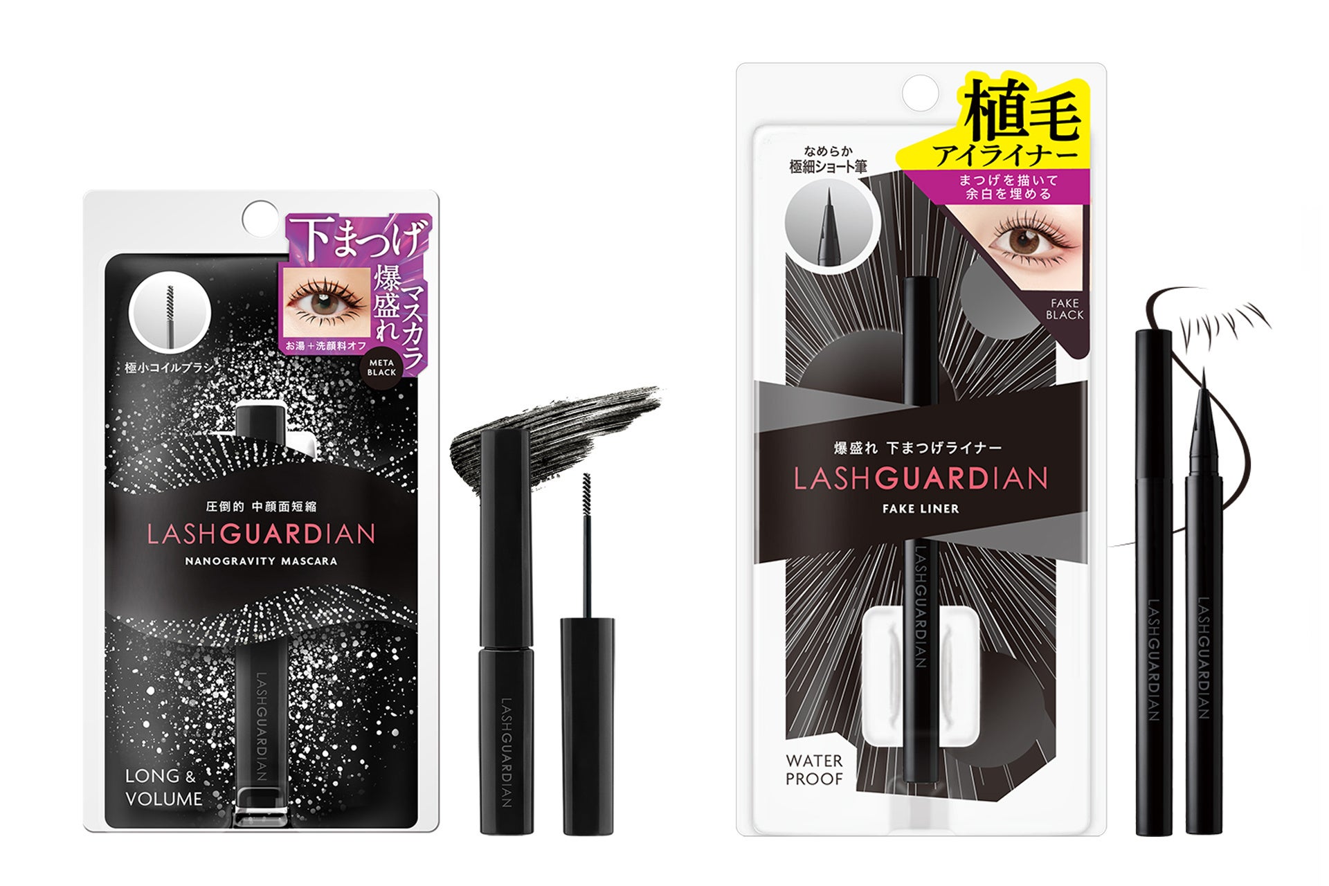 下まつげ用の極細アイライナー「ラッシュガーディアン フェイクライナー」 2品が数量限定で登場いたします。「ラッシュガーディアン ナノグラヴィティマスカラ」はつけま級の束感下まつげで、圧倒的な中顔面短縮が叶う、下まつげ爆盛れマスカラです。「ラッシュガーディアン フェイクライナー」は極細ライン、植毛級の描き下まつげも狙い通りに仕上がる、下まつげ爆盛れ極細ライナーです。