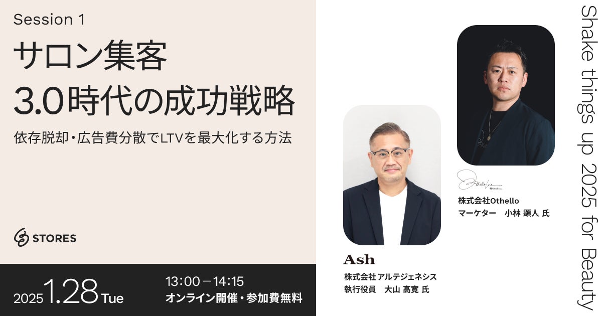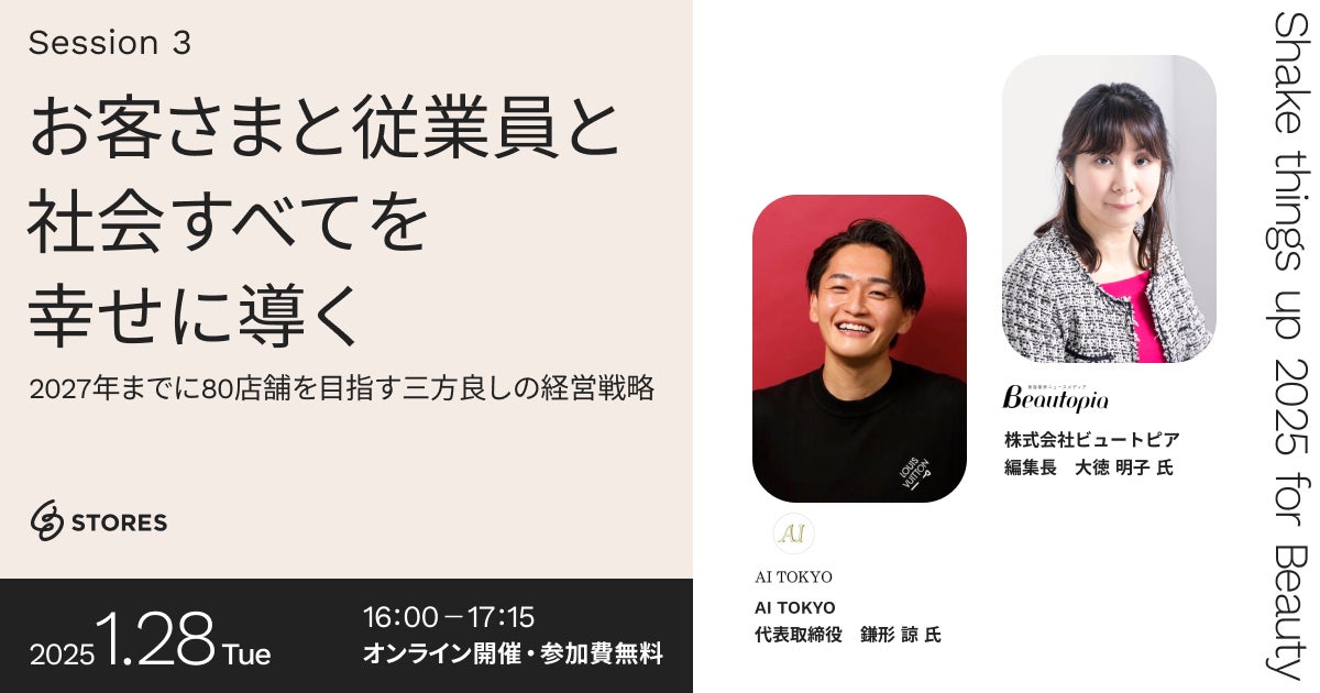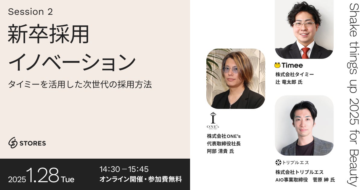 STORES 株式会社(以下、STORES)は、サロン業界向けのビジネスカンファレンス『Shake things up 2025 for Beauty』を開催します。本カンファレンスでは、「Shake things up(変化を取り入れる)」をテーマに、サロン業界で常にテーマとして挙げられる、採用・集客・育成・マネジメントについて、業界を牽引する企業に登壇いただき3つのセミナーを実施します。