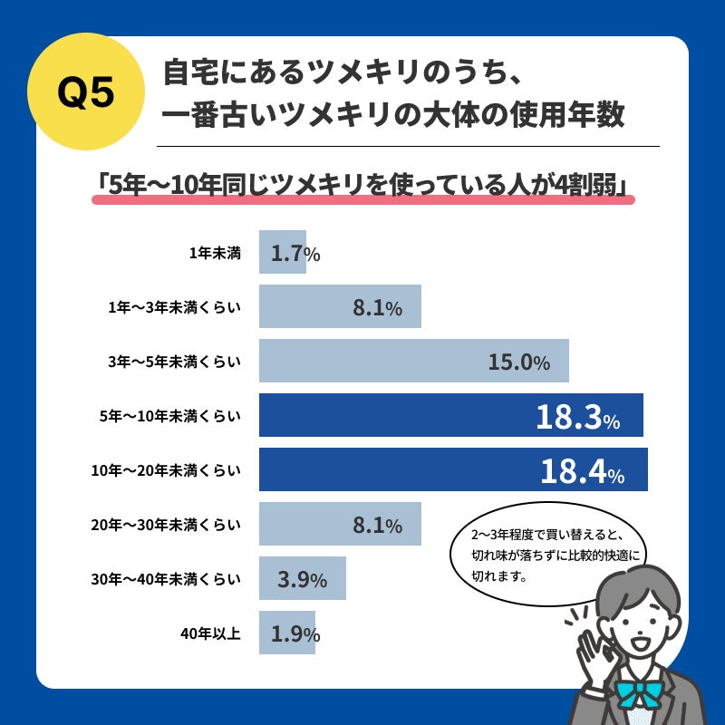 ツメキリの使用年数は、全体では「5~10年未満くらい」「10年~20年未満くらい」と答える人の割合が高く、5年以上同じツメキリを使っている人が多いことが明らかになりました。