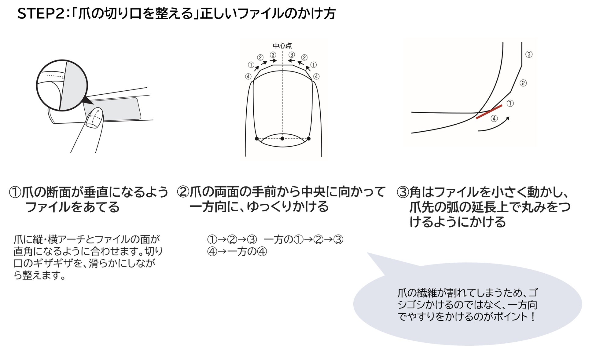 爪のやすりがけは実は重要な工程です。爪を切ったままにしておくと、何かに引っかかって割れや欠けが起こる原因になります。