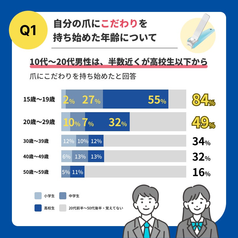 10~20代男性は、半数近くが高校生以下から爪にこだわりを持ち始めたと回答。